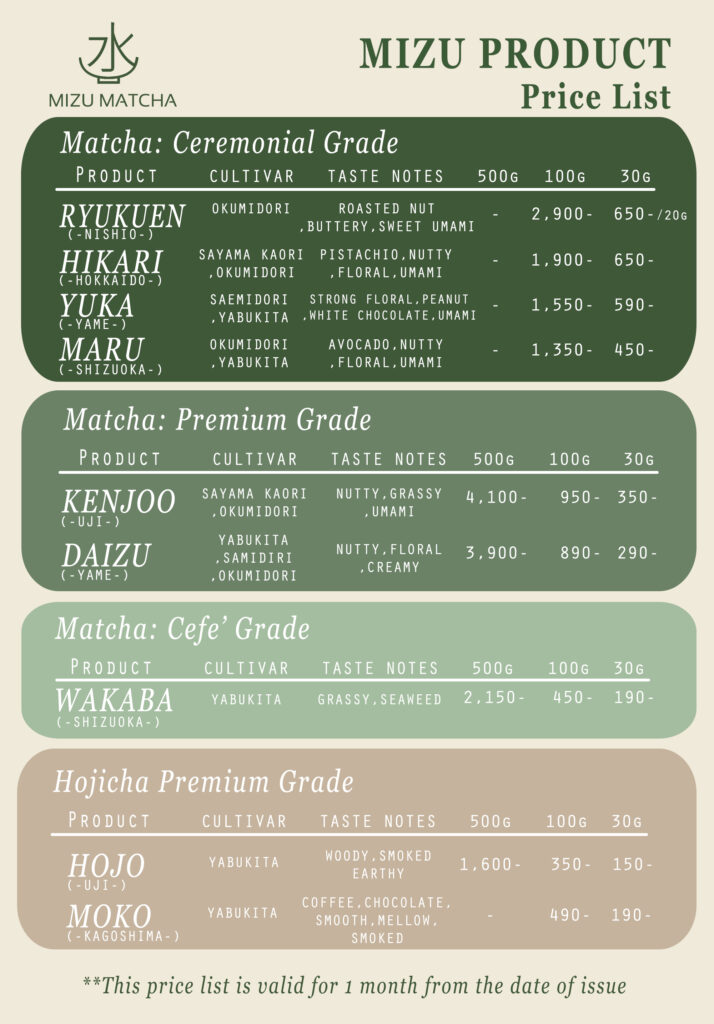 ผงมัทฉะเกรดพิธีการจากเมือง Niseko จังหวัด Hokkaido ต้นชาสายพันธุ์พิเศษ Sayama Kaori ถึกทนหนาว หอมดอกไม้ให้รสโทนถั่วพิสตาชิโอ้+ฟอรัลดอกไม้ บอดี้เข้มข้น มีความครีมมี่ อูมามิลึก หวานปลาย ไม่ขม มีกลิ่นหอม รสมันนัวคล้ายถั่วแมคาเดเมียไม่มีความคั่วใดๆ สีเขียวเข้มสดสวยคล้ายสีของหยก เหมาะชงเพียวและทำลาเต้ สามารถชง koicha ได้ อัตราส่วน 1 ต่อ 10 กรัม