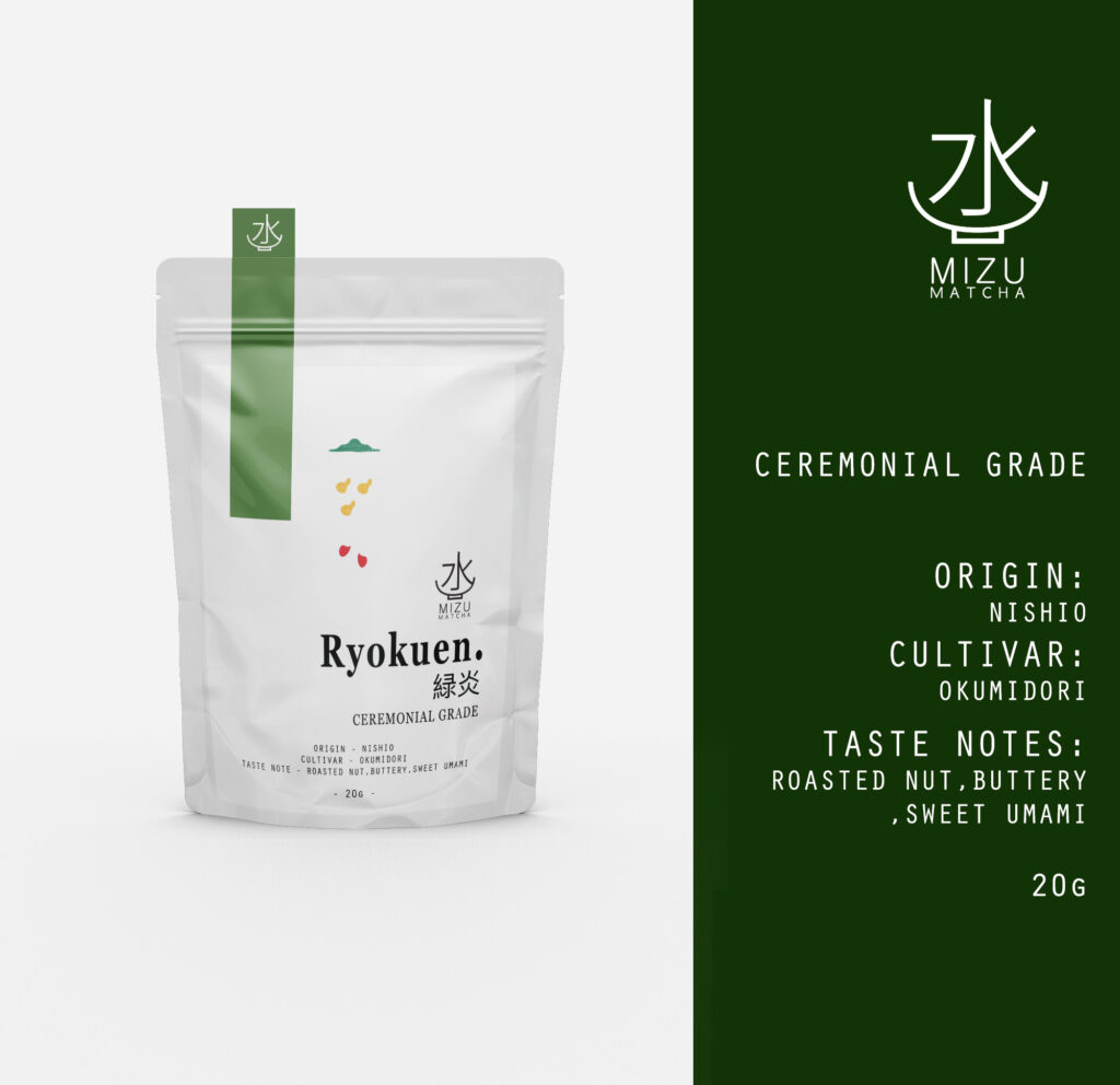 เปลวไฟ ของความเขียว คือ ชื่อนิยาม ของ Ryokuen มาจากไร่ชา จากจังหวัด Nishio เป็นสายพันธุ์เดียว Okumidori ผงมัทฉะเกรดพิธีการตัว Top เทสโน๊ต ถั่วคั่วชัด ผสานความมันนัวแบบเนย รสอูมามิลึก บอดี้แน่น แต่คงความเขียวสดสว่างอย่างสง่างาม ตามแบบฉบับมัทฉะจาก Nishio ไม่มีความขม ปลายมีความหวานและอูมามิยาวนาน สามารถชง Koicha ได้